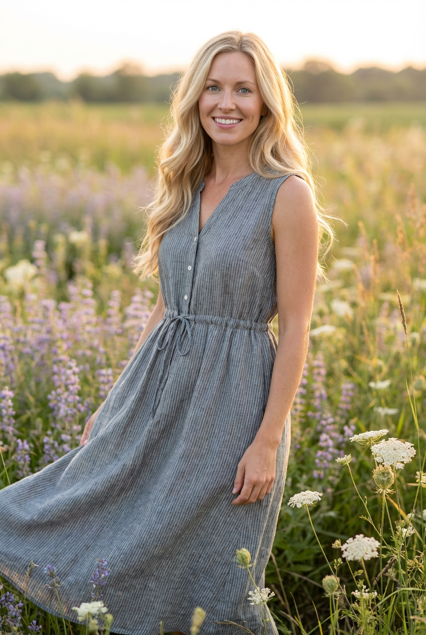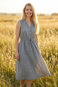 This dress is both a cotton and linen blend, made with fully natural fibers. It has a sheer finish that would pair well with a slip or neutral base pieces. Layer this dress in the cold seasons or wear as is in the summer! The dress is bump and nursing friendly.