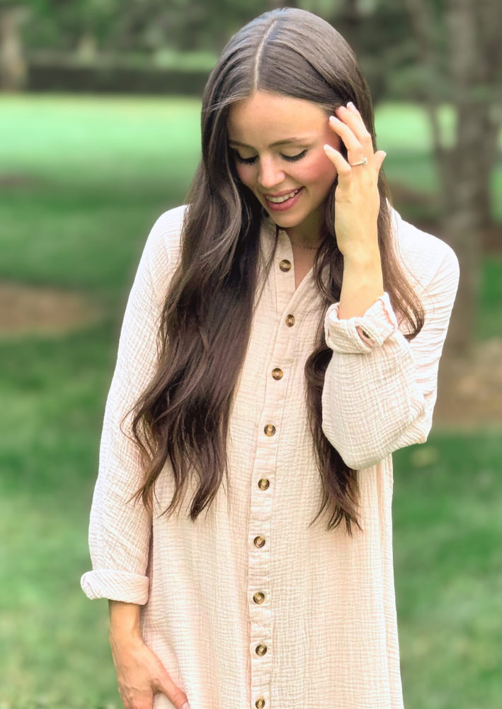 Designed in pure cotton with a breezy, semi-sheer finish that layers beautifully with a slip or neutral base pieces. This dress is also nursing friendly.