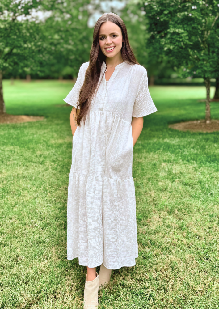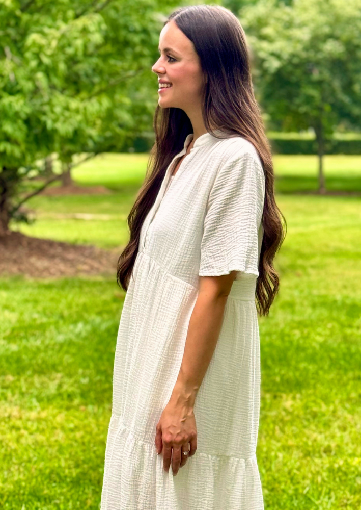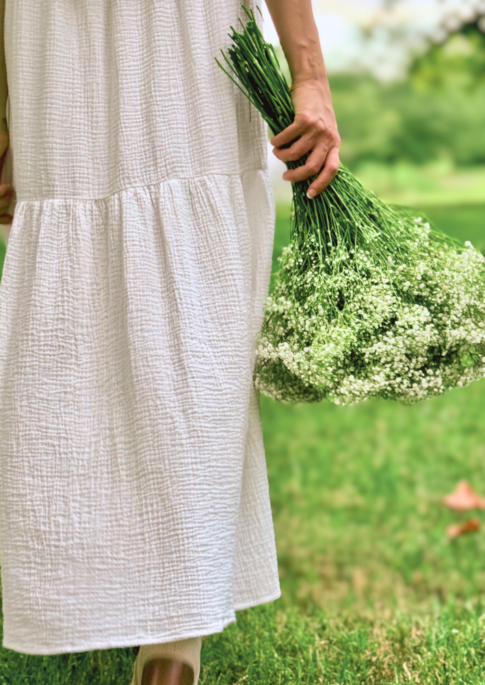 Designed in pure cotton with a breezy, semi-sheer finish that layers beautifully with a slip or neutral base pieces.