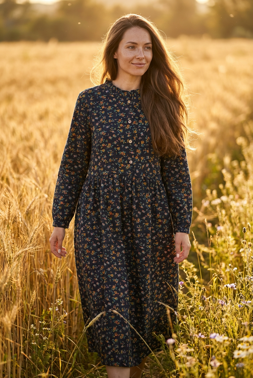 This dress is both a cotton and linen blend, made with fully natural fibers. It has a semi-sheer finish and layers beautifully with a slip or neutral base pieces. The dress is nursing and bump-friendly.